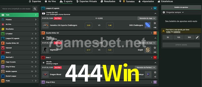 O 444Win oferece uma grande seleção de opções de apostas em e-sports com probabilidades competitivas